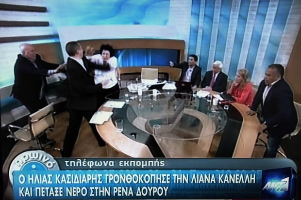 Kasidiaris levantou-se, jogou um copo de água no rosto da deputada e a insultou. Outra deputada que participava do debate, a comunista Liana Kanelli, protestou e Kasidiaris a empurrou, a agrediu com socos e depois deixou o estúdio.